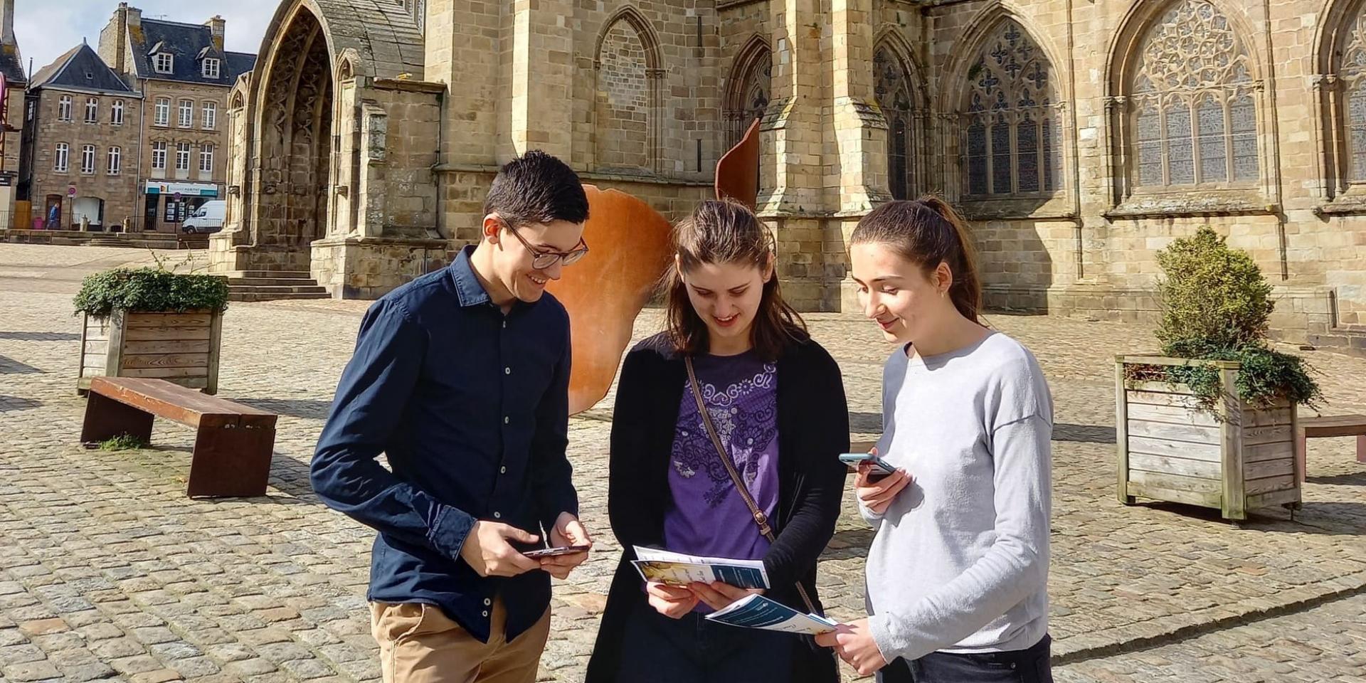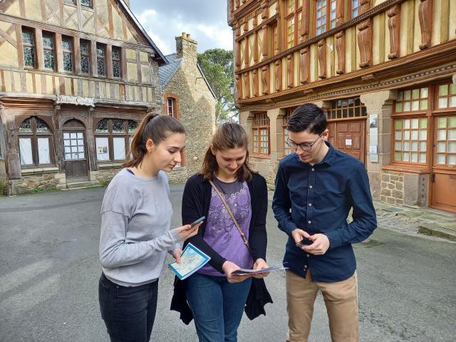 We’re players, so we’re forming teams. Alexis with Lise and Ernest, hold Ernest! I’m with Maÿliss and Léa. Between us, it’s who finds the secret manuscript before the others. So we check the batteries in our smartphones! We’re ready to scan the QR codes that will guide us through the history of Tréguier and its illustrious characters.