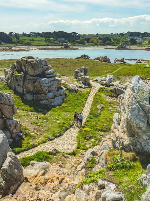 Balade en famille face à l'îlot de Costaérès à Trégastel le long du sentier des douaniers.